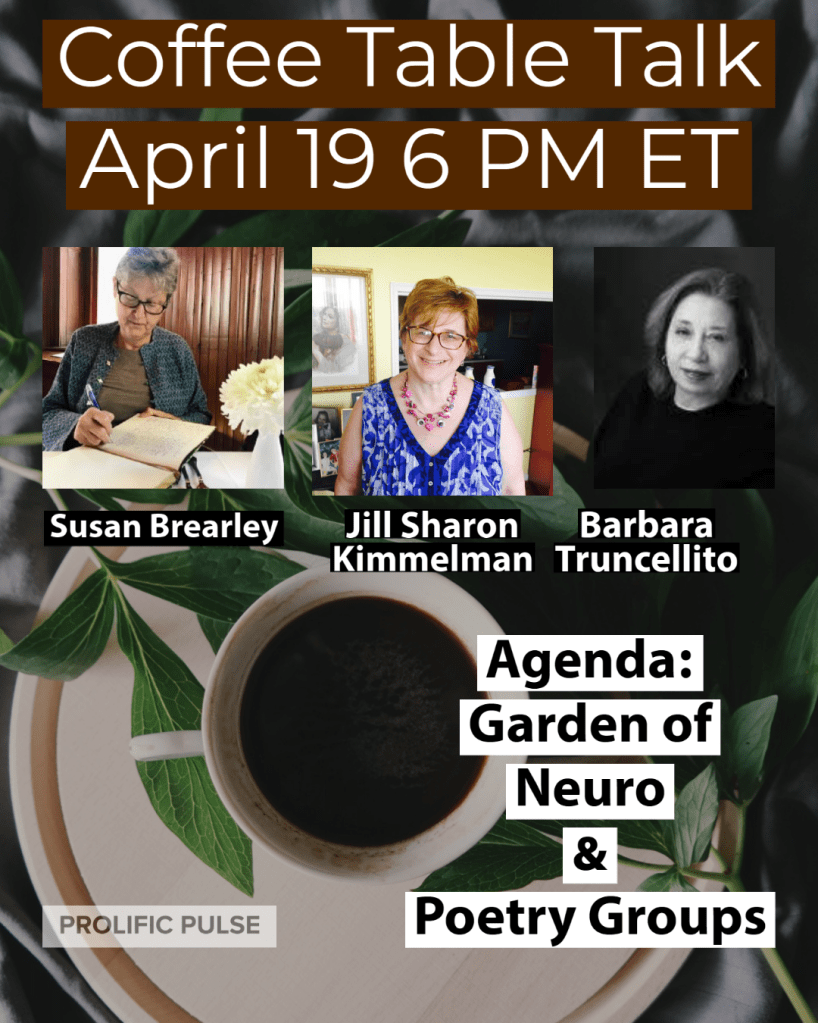 Just like in the old days when poets came together, perhaps imbibed, or had some coffee, and talked about the problems of the world and how they would use poetry to speak their minds. This is a Coffee Table Talk. We will have a select group of panelists: Susan Brearley Jill Sharon Kimmelman Barbara Truncellito For this event: Susan Brearley will ta…