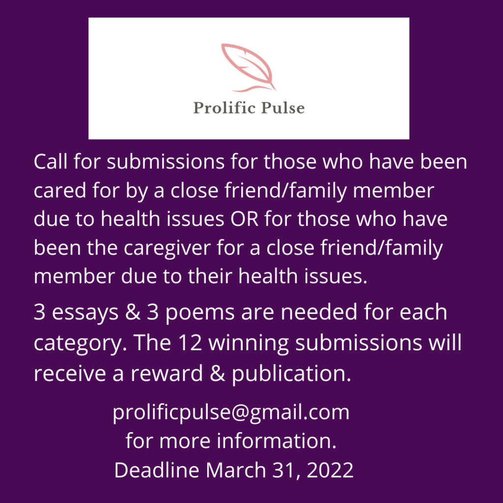 Prolific Pulse Press LLC needs 3 essays and 3 poems about what it is like to be a caregiver of a family member or close friend who has become ill.