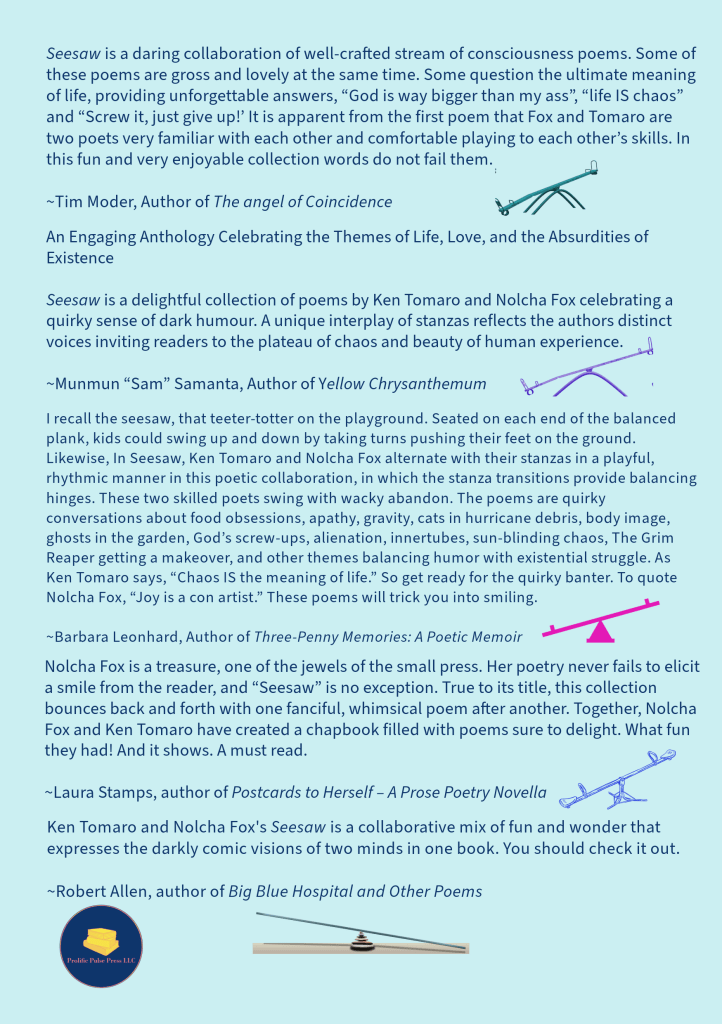 Born from a shared love of dark humor and playful wordplay, Seesaw is a delightful balancing act of wit, whimsy, and poetic mischief. Ken Tomaro and Nolcha Fox first crossed creative paths in the Thursday Night Poets group, where their mutual knack for quirky, offbeat humor sparked an unexpected collaboration. What began as playful exchanges-plucking words and phrases from each other’s poems to craft something new-quickly evolved into a collection that swings between the light and the dark, the serious and the absurd.