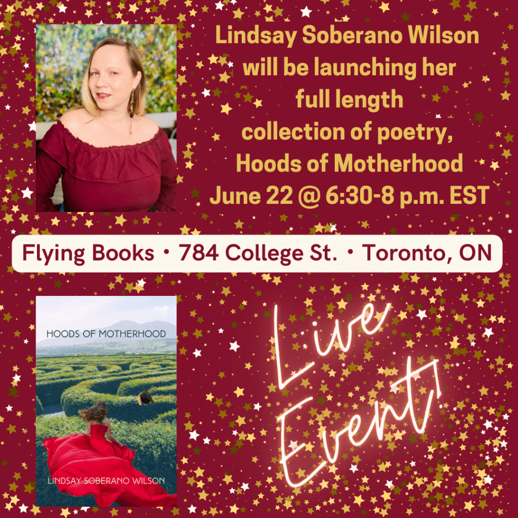 In Hoods of Motherhood: A Collection of Poems, Lindsay Soberano Wilson, a first-generation Jewish Canadian granddaughter of Romanian Holocaust survivors and Spanish Moroccan immigrants, compiles a bittersweet portrayal of becoming a mother. From the highs and lows of recurrent miscarriages to contending with c-section shame, to larger issues such as intergenerational trauma, and everyday issues like breastfeeding, Soberano Wilson’s first full book of poetry, is relatable, lyrical, and confessional with evocative imagery, allusions, wordplay, rhyme, and rhythm.